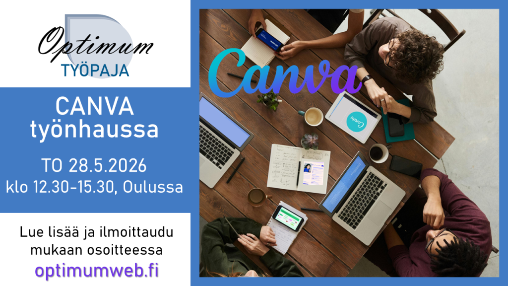 Tässä työpajassa saat alkuun perusteellisen perehdytyksen Canvan teknisiin saloihin ja heti sen jälkeen pääset soveltamaan oppeja omien työnhakumateriaaliesi parissa. Voit työstää juuri niitä materiaaleja, joita sinä tarvitset työnhaussa, olipa se CV, LinkedInin taustakuva tai mitä tahansa. Tarjolla on vinkkejä, ideoita, inspiraatiota, palautetta ja kehittämisehdotuksia niin vetäjiltä kuin muilta osallistujiltakin, sekä tietysti vino pino Optimumin mallipohjia. Työpaja on samalla loistava mahdollisuus myös verkostoitua muiden korkeakoulutettujen asiantuntijoiden kanssa.