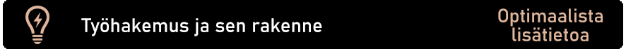 Työhakemus on CV:n aisapari, joka kohdennetaan vielä vahvemmin haettavaan tehtävään ja organisaatioon. Työhakemuksessa tuot esiin motivaatiosi ja pätevyytesi kyseiseen tehtävään: miksi olet kiinnostunut kyseisestä työpaikasta, mitä osaamista ja kokemusta sinulla on ja miksi olet sopiva valinta tehtävään? Hakemuksen pitäminen napakkana, ytimekkäänä ja selkeänä on taitolaji, sillä usein tekisi mieli sanoa ja kirjoittaa kaikki mahdollinen. Tiivistämisen ja relevantissa sisällössä pysymisen taitoa siis tarvitaan hakemusta kirjoitettaessa. Pyri tuomaan esiin ne asiat, jotka tekevät sinusta parhaan mahdollisen valinnan kyseiseen työpaikkaan. Ohjeita ja työkaluja toimivaan ja haastatteluun johtavaan työhakemukseen löydät alta.